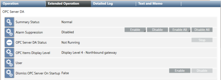 - Enabled only when the Desigo CC OPC DA server is running and lets you stop the Desigo CC OPC DA server, so that when it starts again, the latest configuration is loaded. For more details, see OPC Items Data Alignment.