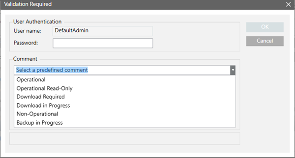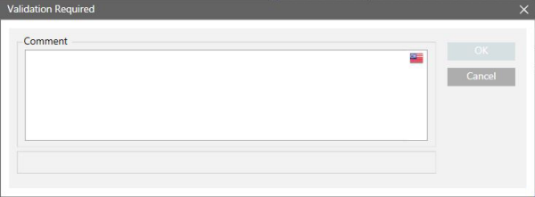 This section and the next section show two dialog boxes for each validation profile. The first dialog box requires a user-entered comment. The second dialog box requires a selection from a predefined list of comments. The actual dialog box that displays when you change or command a validated object depends on whether predefined comments have been configured for the object. If predefined comments were not configured, you will see the first dialog box. If predefined comments were configured, you will see something similar to the second dialog box.
