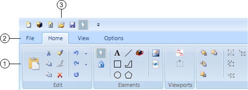 1 | Tabs and Groups | Tabbed menu bar that enables you to customize your workspace, and create, edit, and format your graphic images. The three tabs include the Home, View, and Options. Each tab includes a series of selectable task buttons organized into groups. |