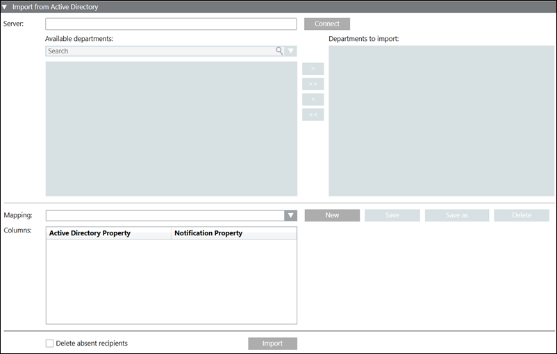 The Import from Active Directory expander allows the import of a department consisting of recipient users from an Active Directory.