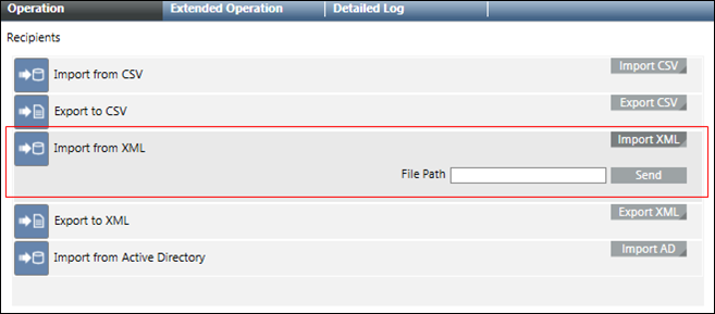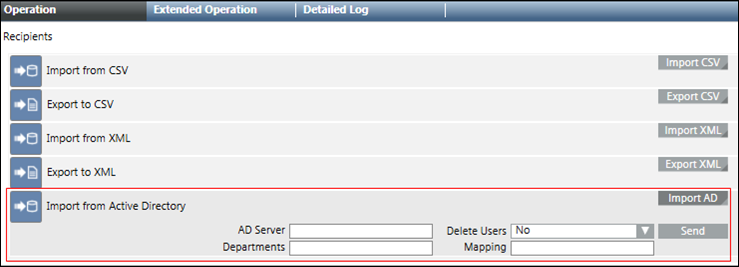 The Import tab allows the import of recipients from XML and CSV files and a department consisting of recipient users from an Active Directory.
