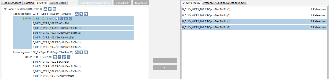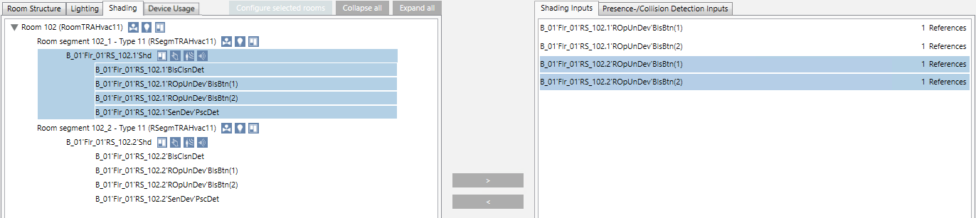 - Highlight the shading inputs RS_102.2‘ROpUnDev‘BlsBtn(1) and RS_102.2‘ROpUnDev‘BlsBtn(2). Note that you must perform the assignment in both directions (from segment 1 to segment 2 and from segment 2 to segment 1).