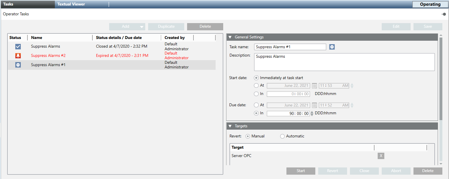 - When the task due date is reached, depending on configuration the commanded objects are set back to their former state automatically, or you may be able to manually send a Revert command (see Revert an Operator Task).