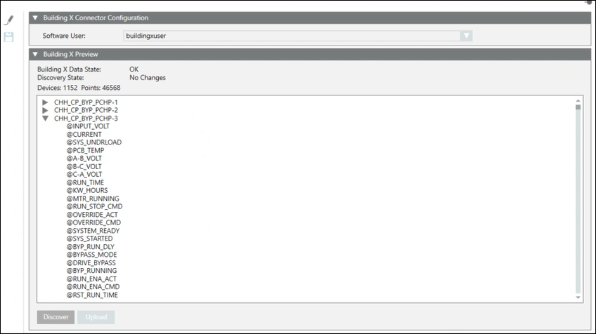 Discover | Discovers devices and points to be uploaded to BX and displays them in the Building X Preview expander. |