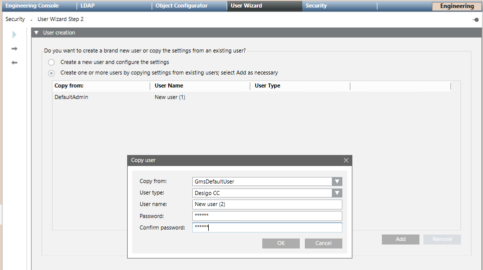 In User type, select the type of user you want create (Desigo CC, Windows, or Software).