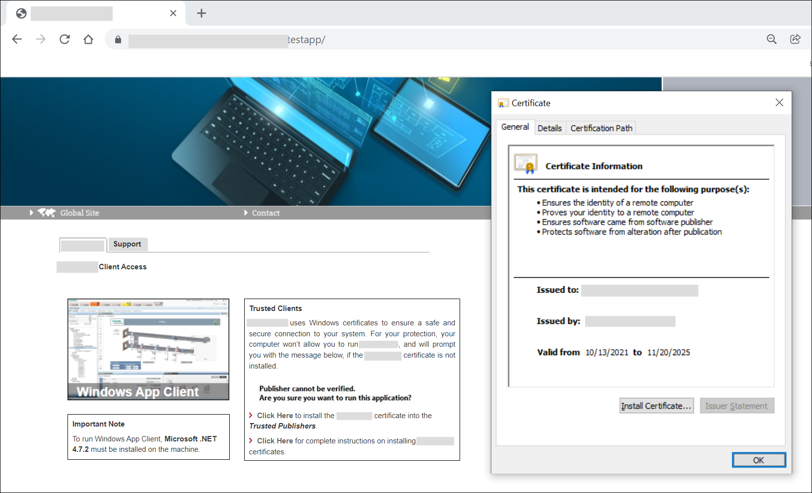 You can launch a Windows App client by browsing the web application link on the local web server (IIS) or on the remote web server (IIS) hosted on a Client/FEP or on remote computer other than web server (IIS). For this you must install the website/web application certificates in the appropriate Windows certificate store.