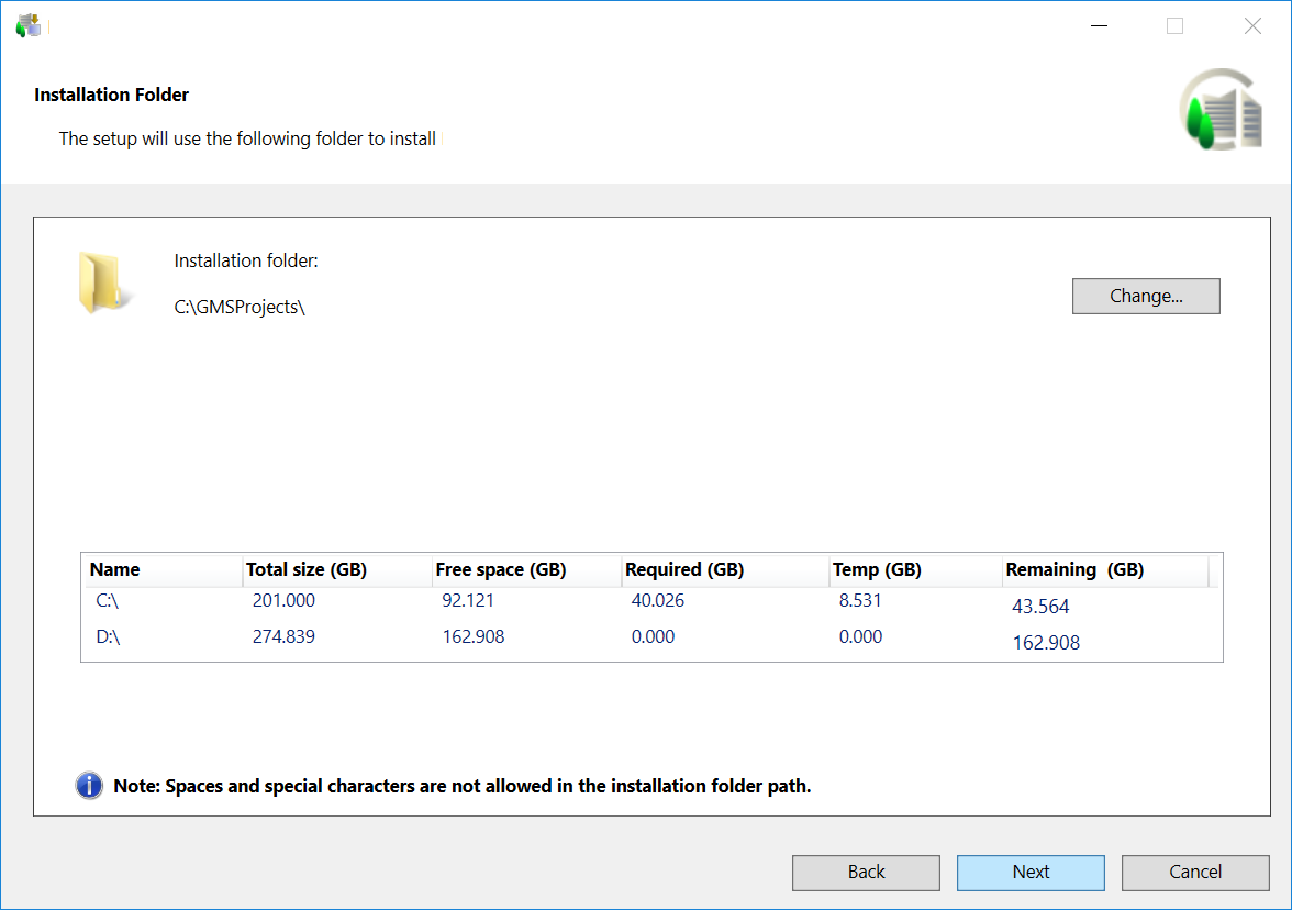 In the Installation Folder dialog box, accept the default installation directory location [Installation Drive]:\[Installation Folder] for the installation or choose a new location by clicking Change. The Installercalculates and displays the disk space required for the selected setup type installation on the selected drive and the temporary disk space required only for the time of installation (always calculated only for the system drive). Click Next. NOTE 1: No illegal characters or sequences are permitted in the directory path. NOTE 2: If a negative number in red displays in the Remaining Space field, you must re-run the setup after freeing the required disk space. (See Tips to Free Up Disk Space in Installation Folder > Verify the Installation Environment) NOTE 3: The installation folder will inherit the ACL rights (Access Control List) from the installation drive. For example, if C is the installation drive the folder C:\[Installation Folder] will inherit the ACL rights from C drive. These rights define permissions given to users related to operations for working with the folder. For more information, refer to the Cybersecurity Guidelines document (A6V11646120 ) for securing this.