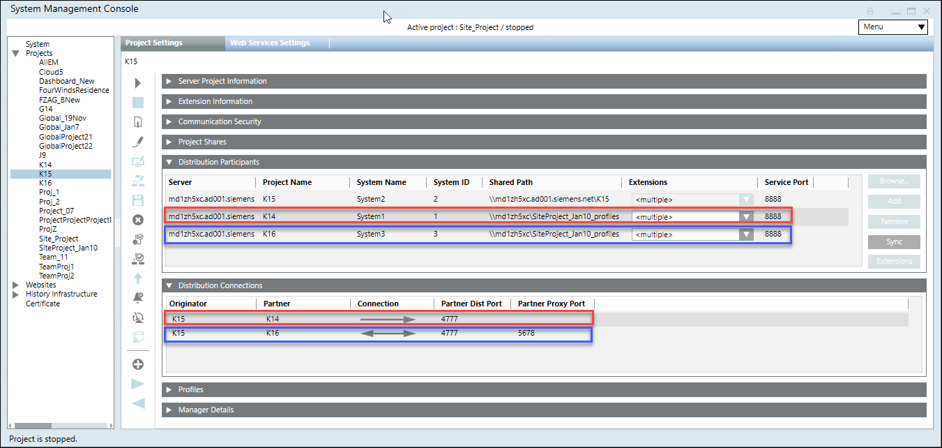 Partner Dist Port | Allows you to type in the dist port of the selected distribution partner project. This port is used to set up the distribution between two systems (projects). When you add the distribution partner project in automatic mode, the Partner Dist Port field in the Distribution Connections expander of the originator project is automatically updated. However, the partner dist port for the partner project is kept blank. When you add the distribution partner project manually, you need to type in the correct partner dist port number in the Distribution Connections expander. NOTE: Ensure that the partner dist port is configured either on the originator system or on the partner system. It is recommended that you configure the partner dist port entry preferably in the originator project. SMC does not restrict you if you add the entry in the originator as well as on the partner system. However, in this case, each distribution manager creates a separate connection for each partner dist port entry; thus resulting in an additional open connection between the partner projects consuming unnecessarily additional bandwidth. |